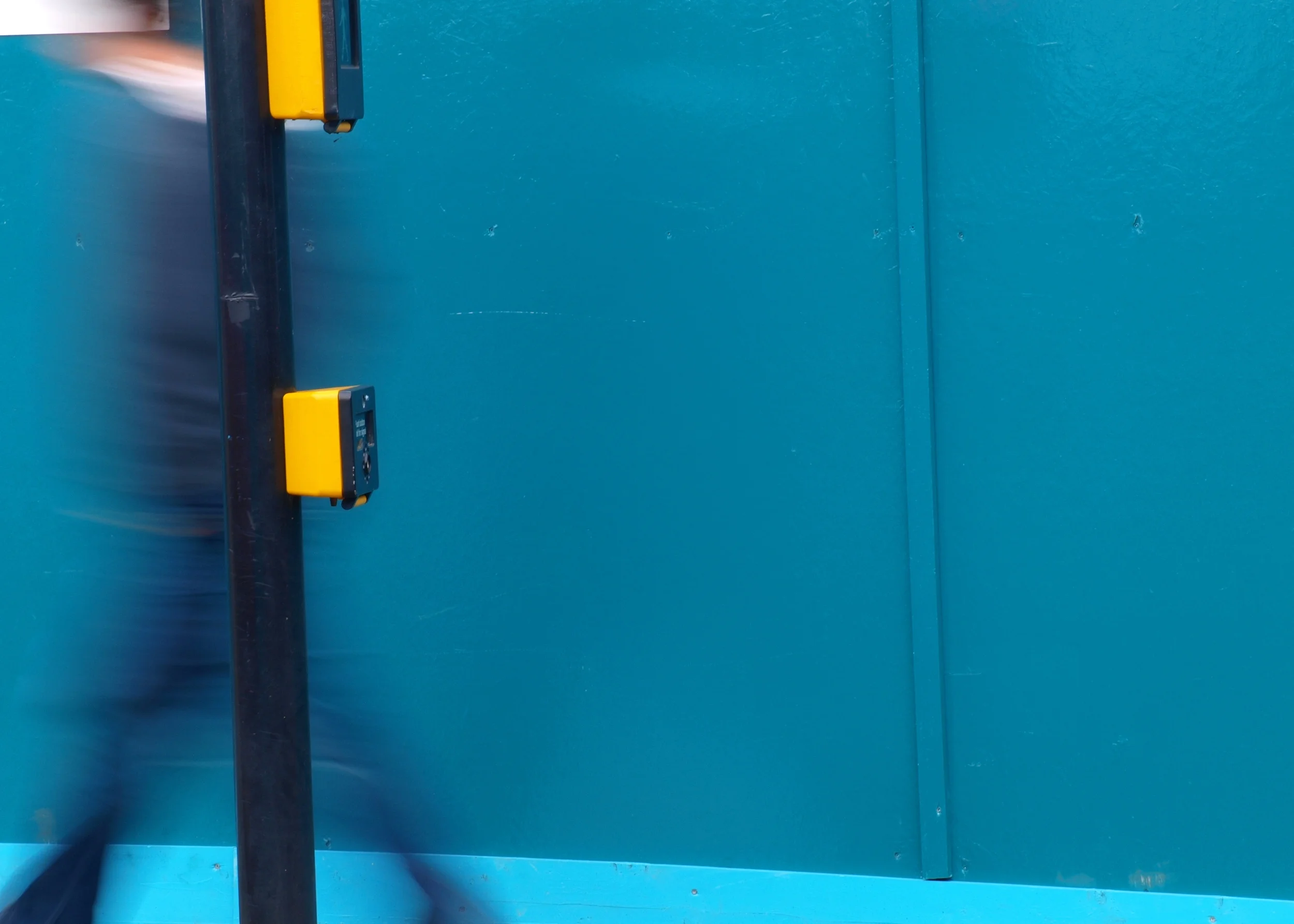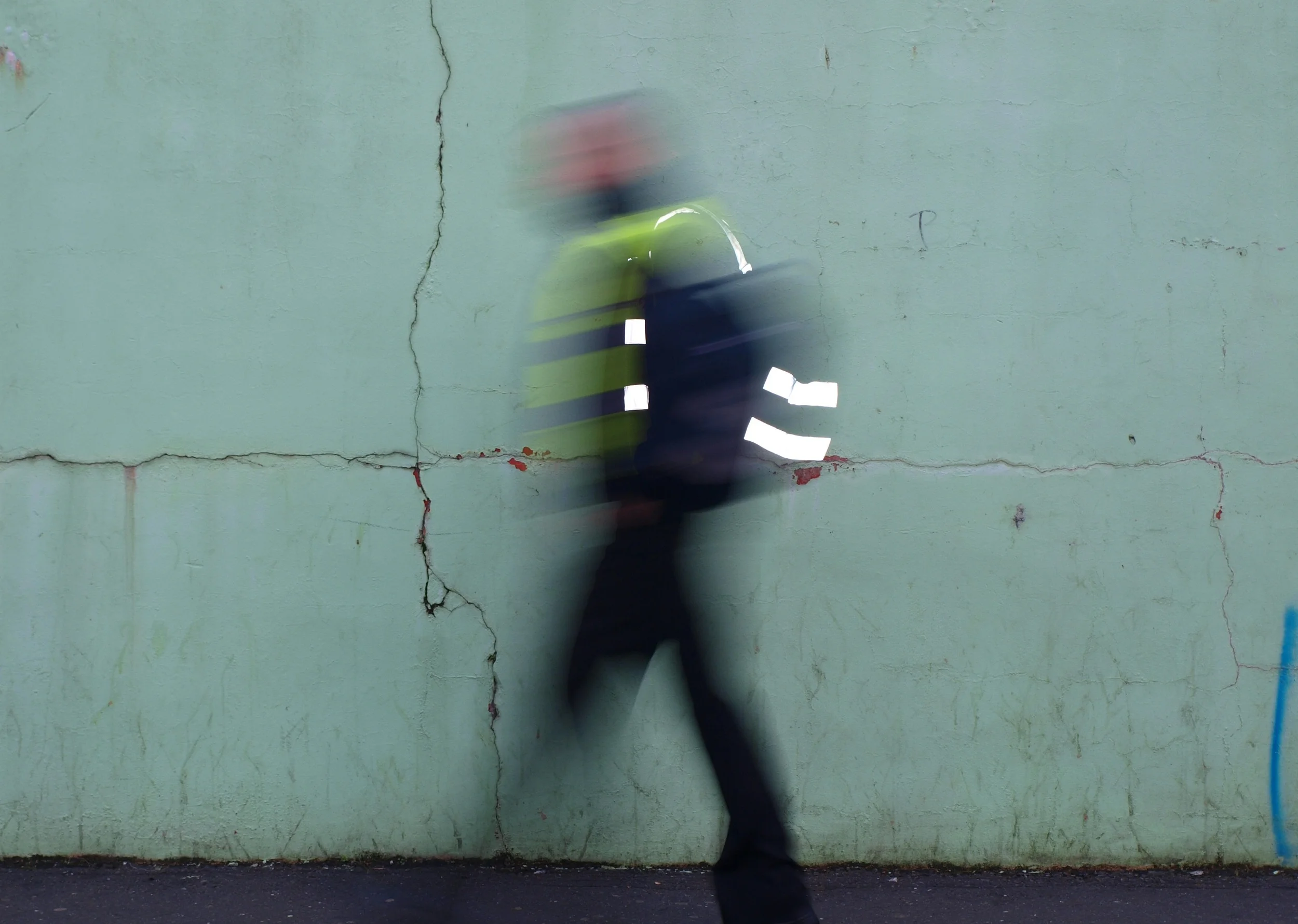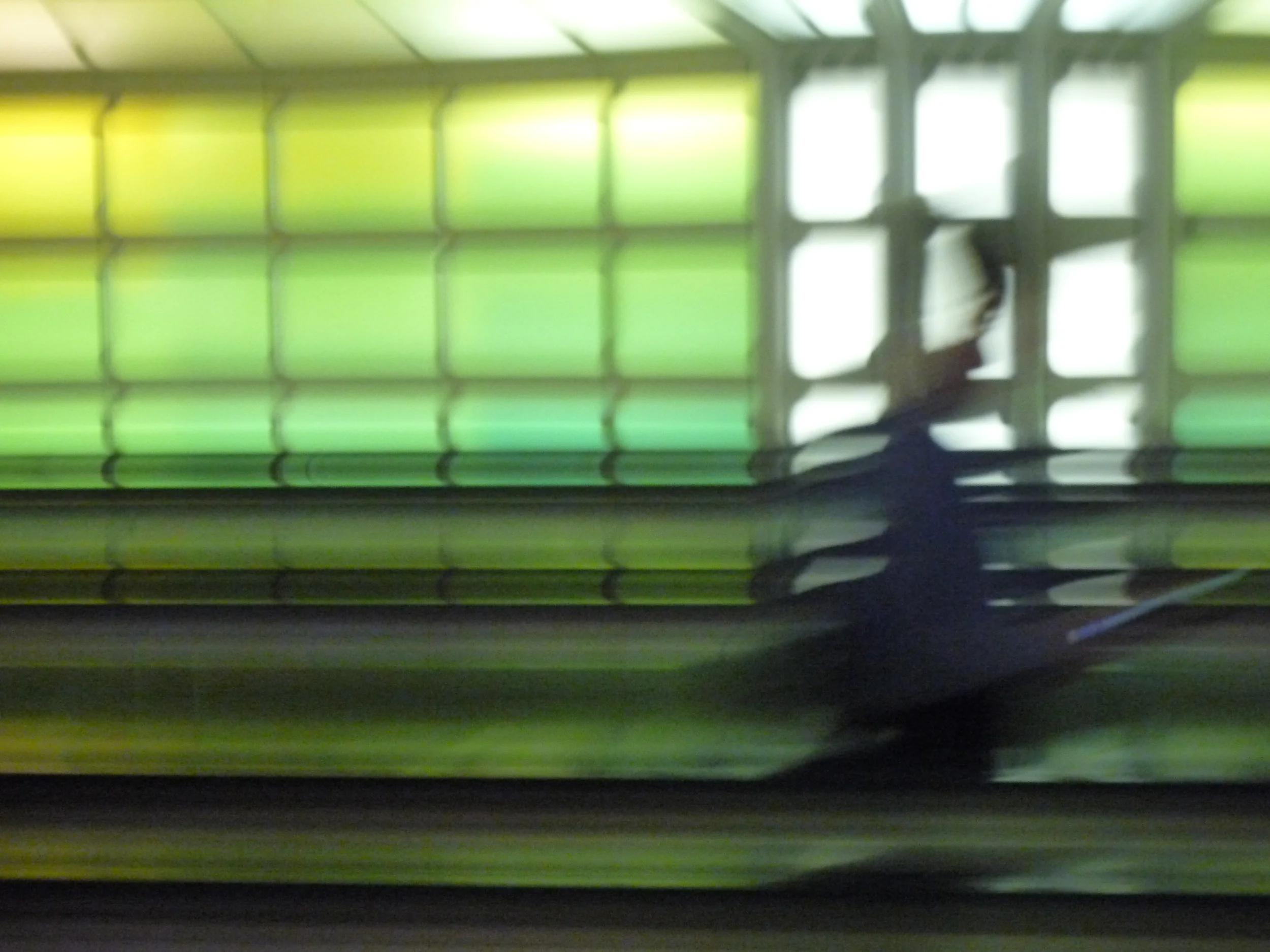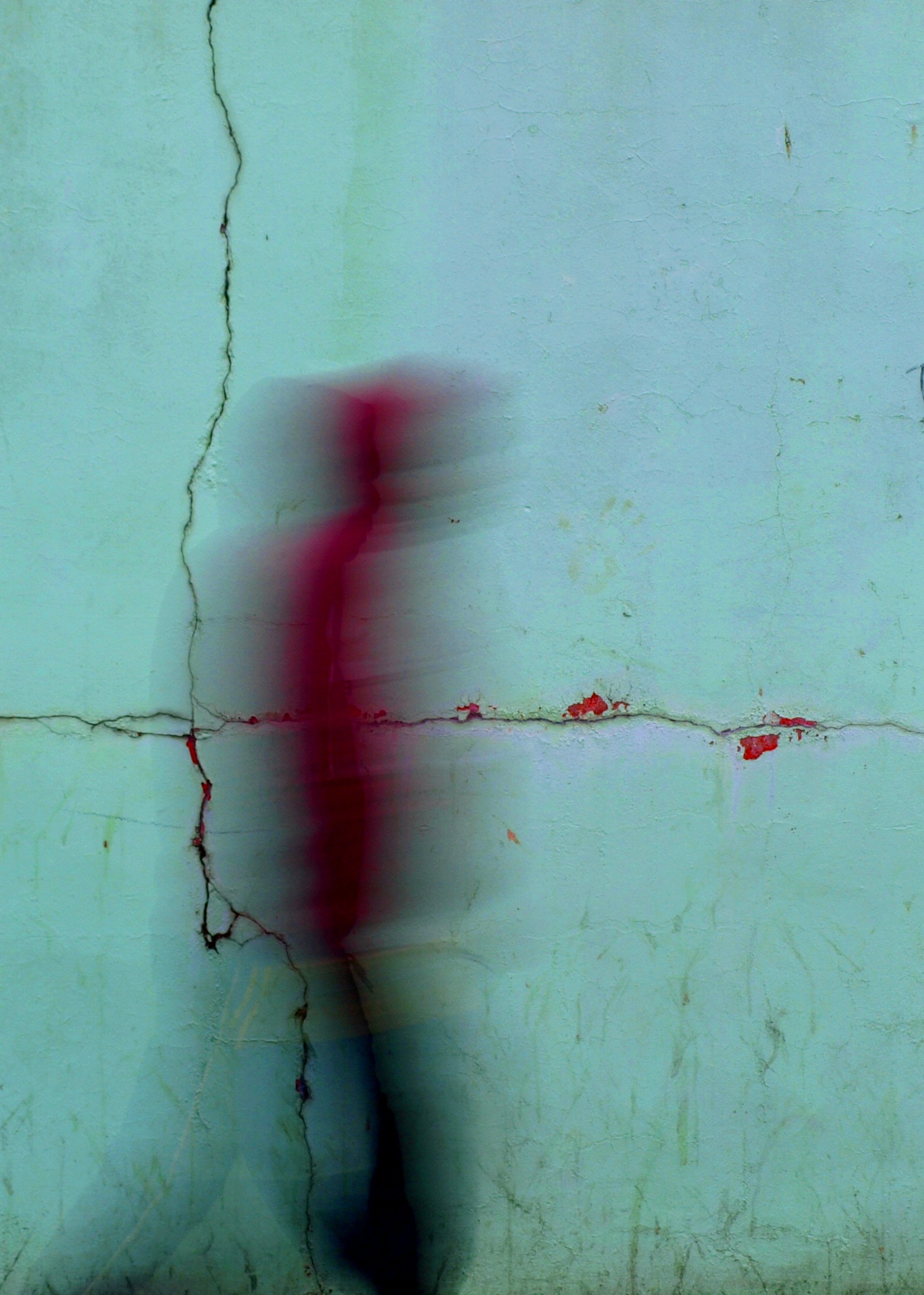 The contrast of stillness and movement seen in passers-by pinned by the axis of a cracked wall or the stripes of neon lights.